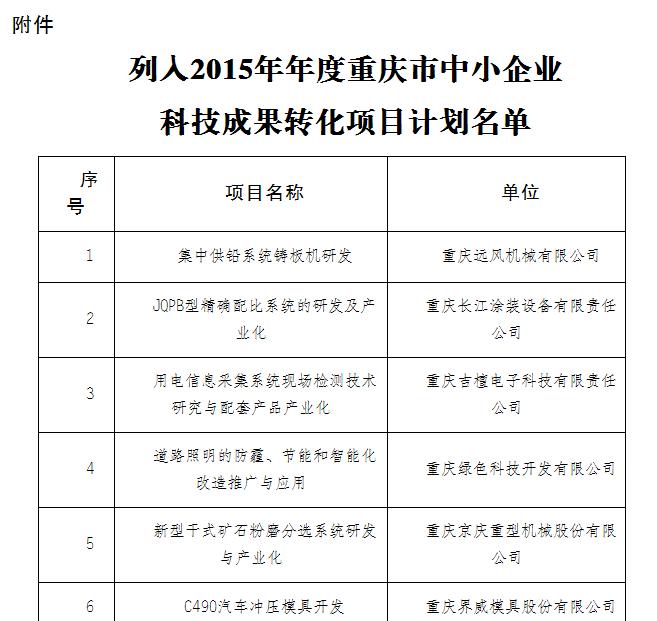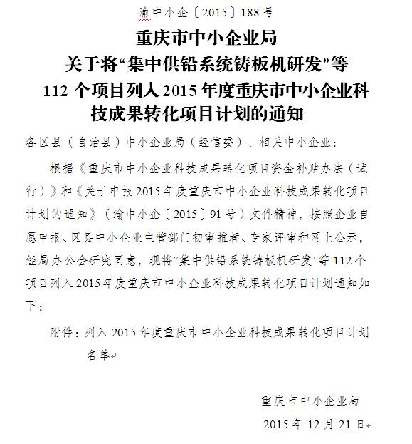 多年以來,重慶城建經濟(集團)重慶綠色科技開發(fā)有限公司與重慶房地產職業(yè)學院進行產學研合作,堅持創(chuàng)新發(fā)展,研發(fā)了“中國創(chuàng)造”“互聯網+多色溫防霧霾亮度可調智能控制系統及LED智能燈具”技術。該技術自2015年7月22日申報2015年度重慶市中小企業(yè)科技成果轉化項目計劃后,現已于2015年12月21日成功列入科技成果轉化項目計劃。通知文件如下: