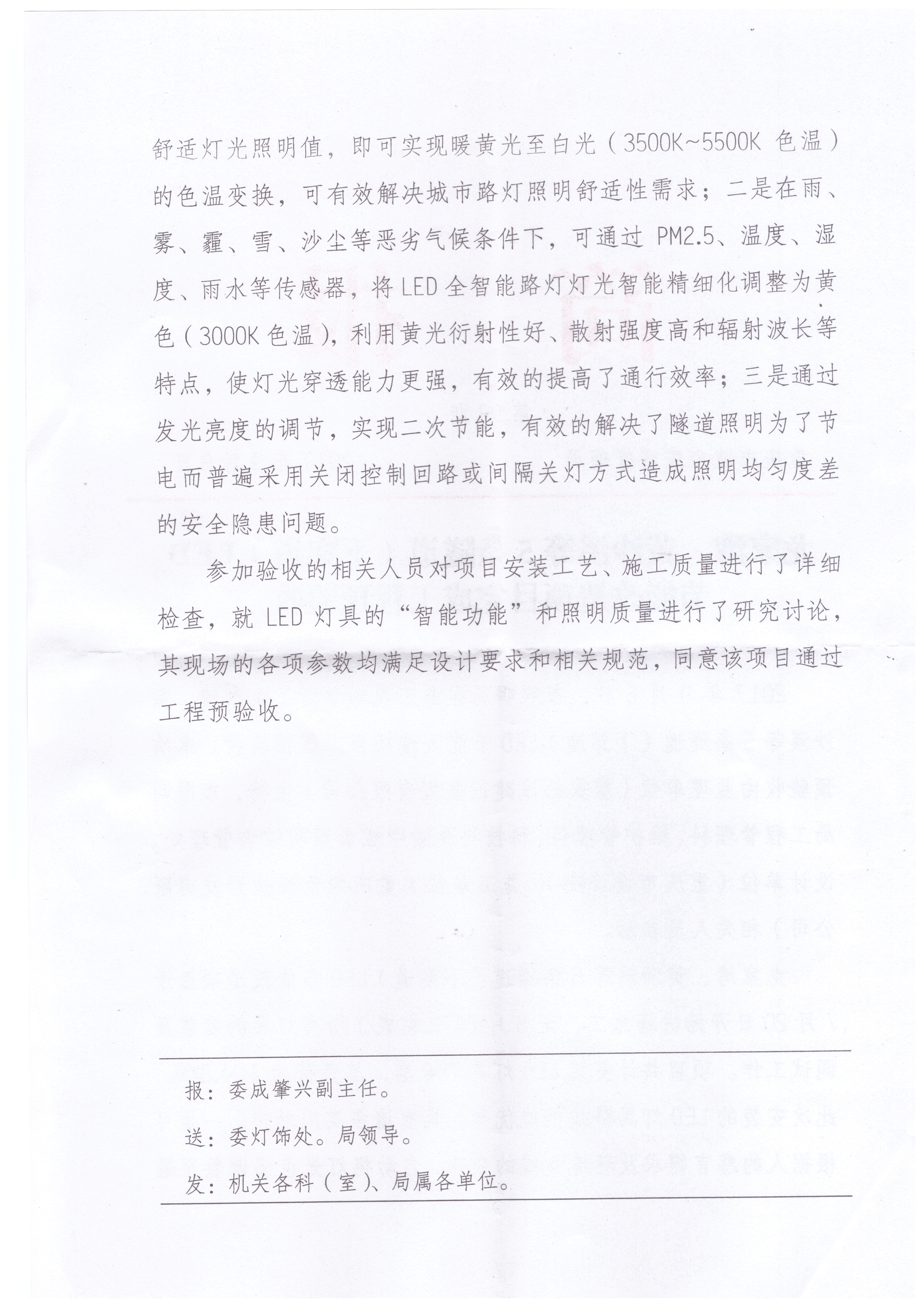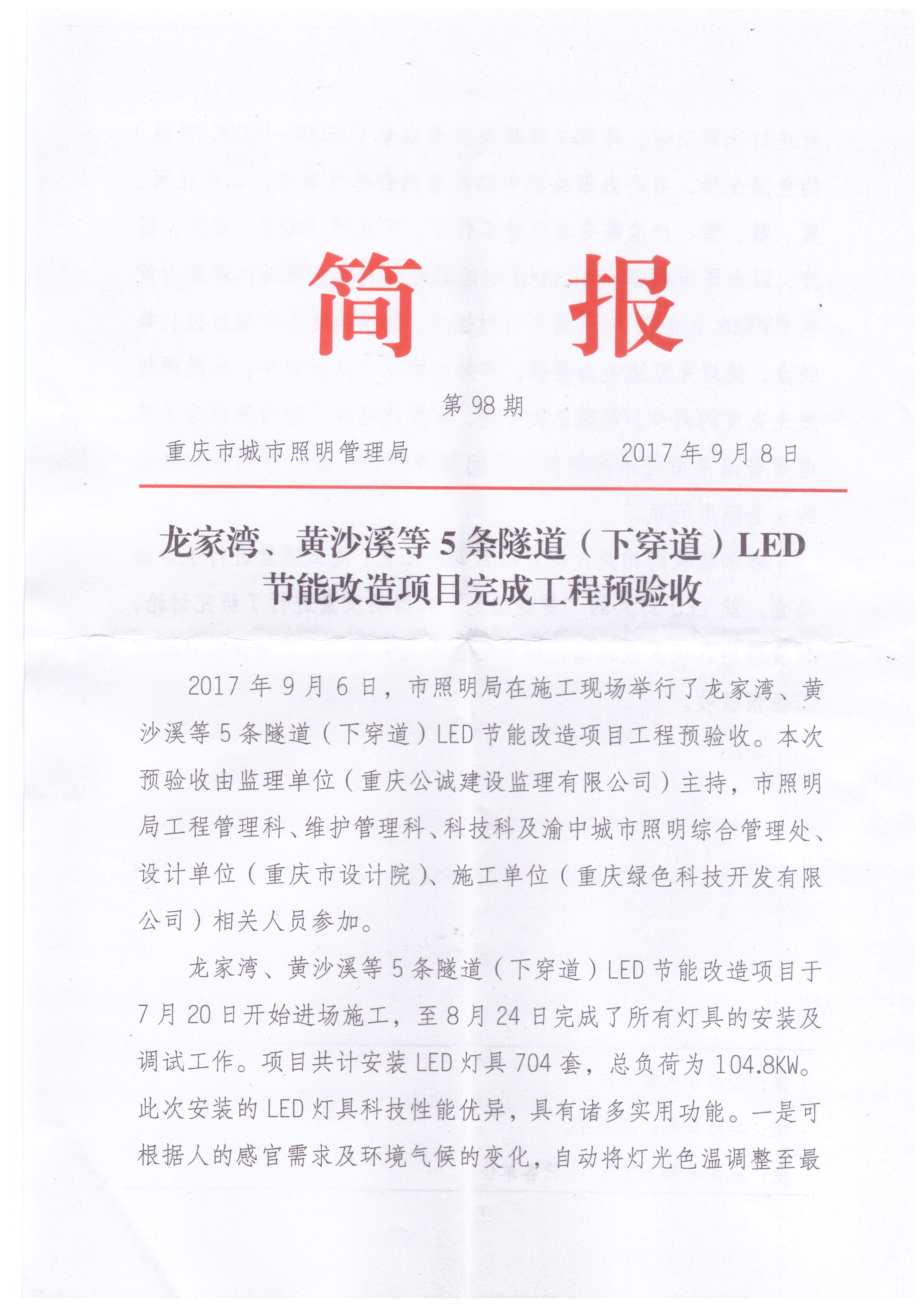 2017年7月31日,我司使用“中國創(chuàng)造”“互聯(lián)網(wǎng)+”多色溫防霧霾LED全智能路燈在重慶市龍家灣、黃沙溪、袁家崗、鵝嶺、陳家坪隧道實施科技節(jié)能改造工程已全面竣工。2017年9月6日,該項目建設(shè)單位重慶市城市照明管理局、監(jiān)理公司及設(shè)計公司對該項目進(jìn)行了現(xiàn)場預(yù)驗收,參會人員對該創(chuàng)新專利產(chǎn)品作出了極高的評價。會后,重慶市城市照明管理局專門印發(fā)了《龍家灣、黃沙溪等5條隧道(下穿道)LED節(jié)能改造項目完成工程預(yù)驗收》簡報(附后),其上級主管部門重慶市城市管理委員會對其進(jìn)行了新聞報道。