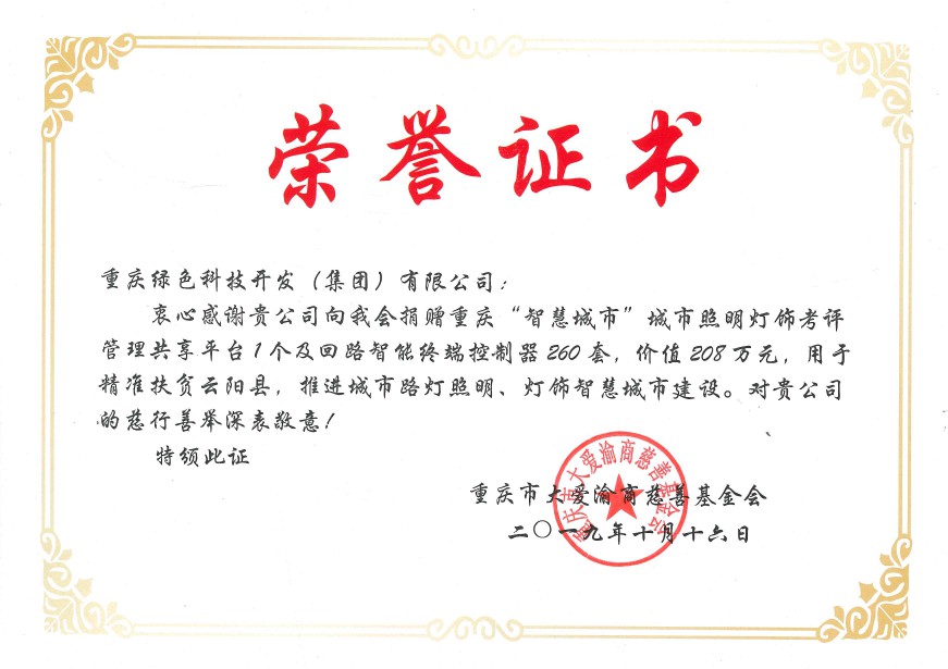 10月16日,重慶綠色科技開發(fā)(集團(tuán))有限公司為支持國家級重點(diǎn)貧困縣精準(zhǔn)扶貧工作,積極推進(jìn)智慧城市建設(shè),通過重慶市大愛渝商慈善基金會,向云陽縣市政設(shè)施管理所捐建了回路智能終端控制器260套,以及配套建設(shè)重慶“智慧城市”城市照明燈飾四級考評管理共享平臺1個,總價208萬元,用于解決云陽縣城市路燈照明智能化管理的問題,幫助云陽縣實(shí)現(xiàn)市政府在《重慶市城市綜合管理提升行動方案》提出的城市照明“一把閘刀”管理的要求。