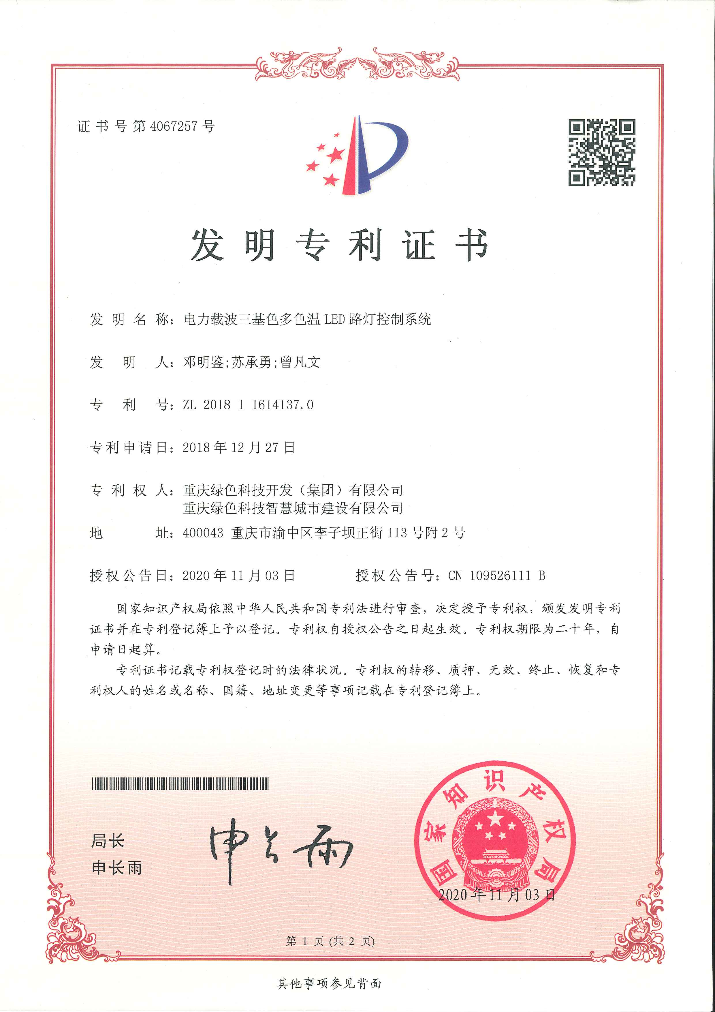 《電力載波三基色多色溫LED路燈控制系統(tǒng)》(專利號(hào):ZL 2018 1 1614137.0)